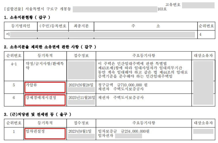 이미 이 집은 주택도시보증공사로부터 가압류가 2023년부터 걸려있었고, 임차권설정도 되어 있었으며, 경매결정이 되어 있는 상태였어요.