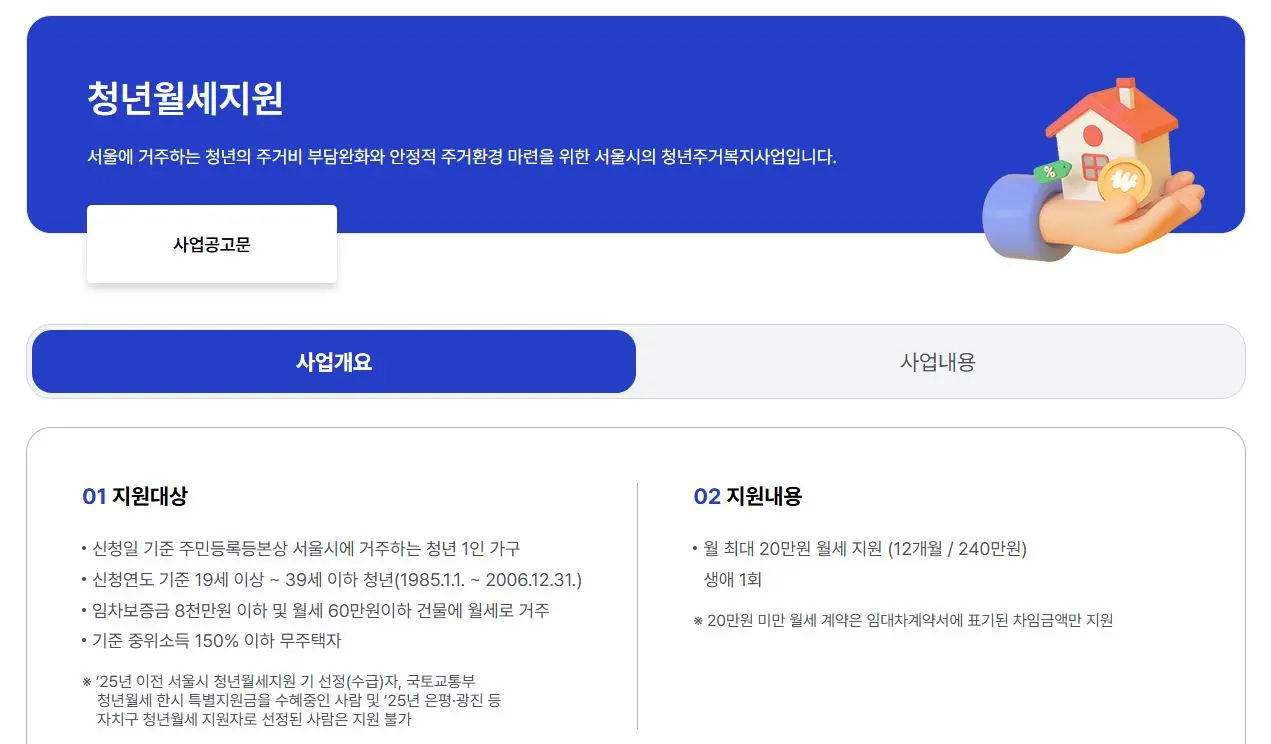 지자체마다 청년을 대상으로 월세지원제도를 운영 중이에요. 조건만 맞으면 월세 일부(최대 수 십만 원)를 지원 받을 수 있어 체감 부담이 확 줄어듭니다.