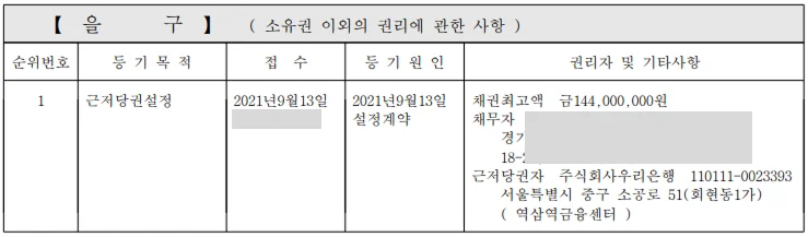 이 집에 은행 빚이 얼마나 잡혀 있는지 나와요. 근저당 금액이 매매가에 가깝거나 넘으면 위험 신호예요. 잔금일에 매도인이 대출을 갚고 근저당을 말소해야 하는데, 말소가 안 될 수도 있거든요.