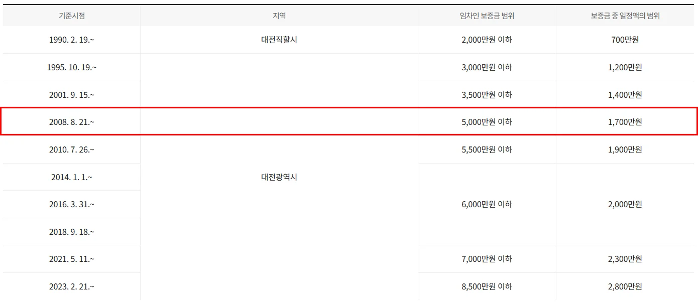 2008. 8. 21.~ 기준 (대전광역시) 임차인 보증금 범위: 5,000만 원 이하이므로 👉 소액임차인에 해당합니다.