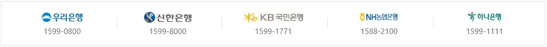 우리은행 1599-0800 / 신한은행 1599-8000 / KB국민은행 1599-1771 / NH농협은행 1588-2100 / 하나은행 1599-1111