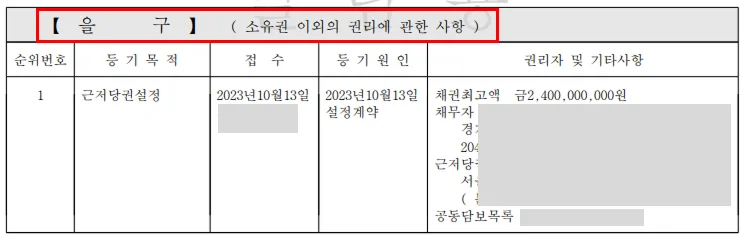 을구 — 소유권 외의 권리, 특히 근저당이 적혀 있어요. 집주인이 이 집을 담보로 은행에서 빌린 돈이에요.