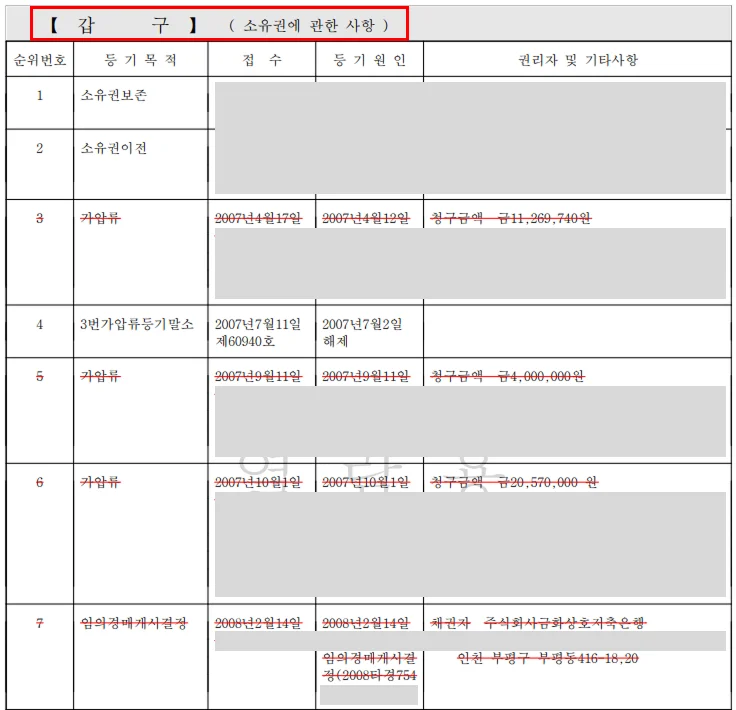 □ 갑구: 가압류·경매·신탁 등 위험 기록이 없는지