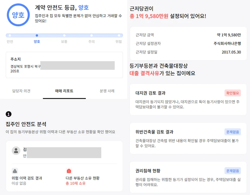 내집스캔의 매매리포트로 권리조사, 안전도 등급, 주의사항, 집주인의 다른 부동산 소유 현황까지 미리 알아보고 계약을 진행해도 늦지 않아요.