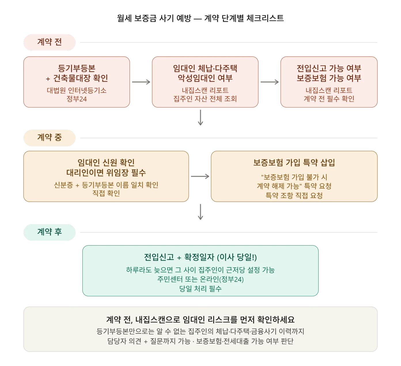 이 시점에 확인해야 할 것이 세 가지인데요, 먼저 등기부등본과 건축물대장으로 집 자체의 상태를 확인하고, 내집스캔 리포트로 임대인의 체납 여부·다주택 현황·악성임대인 등록 여부까지 짚어봐야 해요. 마지막으로 전입신고가 실제로 가능한 건물인지, 보증보험 가입은 될 수 있는 구조인지도 이 단계에서 미리 확인해두는 게 좋아요. 계약서에 사인하고 나서 ‘보험 가입이 안 된다’는 걸 알게 되는 건 이미 늦은 거니까요.