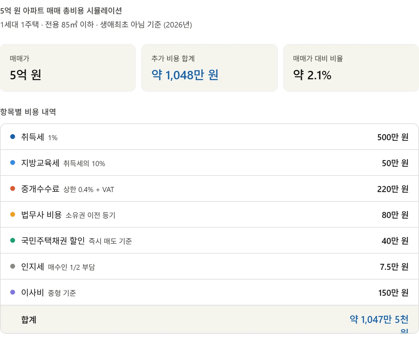 5억 원짜리 아파트(전용면적 85㎡ 이하, 1세대 1주택) 기준으로 매매가 외에 약 970만 원이 추가로 들고, 매매가의 약 2% 수준이에요.