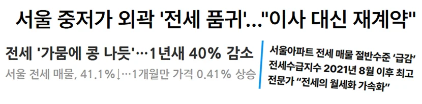 전세 시장이 왜 이렇게 되었는지 전문가들의 분석을 들어보면 대출 규제 강화로 내 집 마련이 어려워진 세입자들이 계약갱신청구권을 적극 활용하면서 기존 물량이 시장에 나오지 않고 있다고 말하고 있어요. 여기에 신규 입주 물량까지 급감하면서 전세 매물 구하기가 너무 어려워졌는데요.
