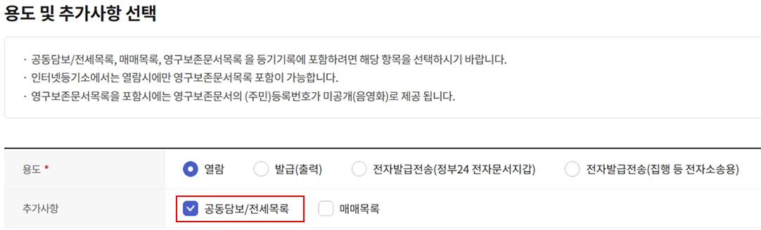 공동담보목록을 등기기록에 포함하려면 아래와 같이 추가사항에서 체크한 후 열람 및 발급을 진행해야 해요.