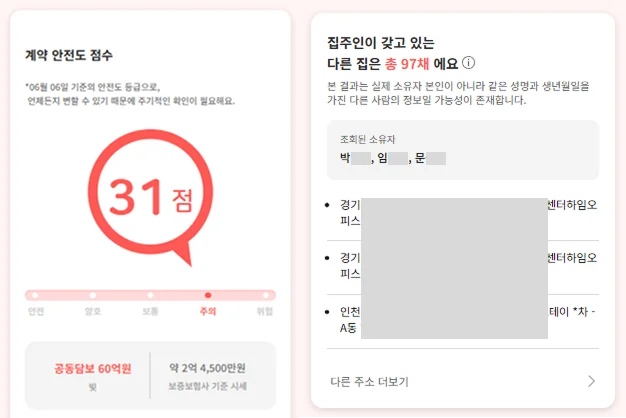실제로 내집스캔으로 최근 조회했던 한 사례를 보면, 공동담보로 설정된 대출 금액만 약 60억 원이었고, 추가로 집주인 명의로 연결된 다른 건물들까지 추적해 보니 최종적으로 총 97채의 주택을 보유한 다주택 임대인인 것으로 확인된 적도 있었어요.