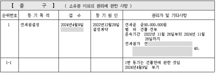 등기부등본 을구에 이미 다른 사람의 ‘전세권설정’이 남아 있다면, 기존 전세권이 말소 진행 중인지, 전세권 말소가 언제, 어떻게 되는지, 잔금 시 말소의 조건인지 확인이 필요해요.